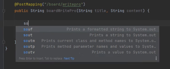 sout + tab을 누르면 println 함수가 쉽게 나온다