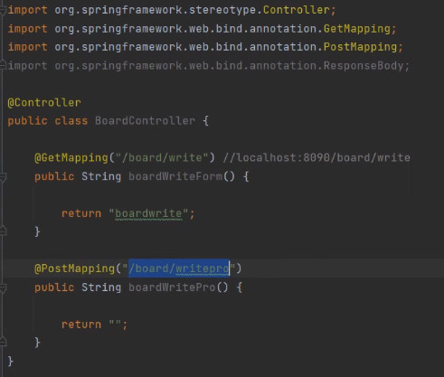 @GetMapping("/board/write/") // localhost:8080/board/write로 접근하면, 이 html 문서를 보여주겠다는 뜻이다