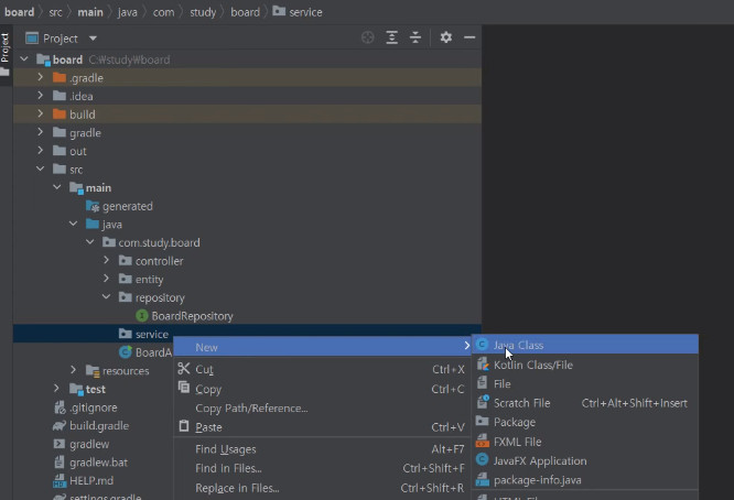2. service package에도 Java Class 파일 만들어주기