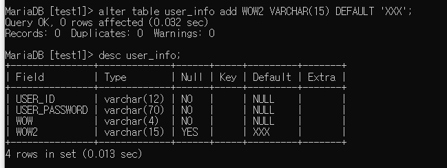alter table user_info add WOW2 VARCHAR(15) DEFAULT 'XXX';