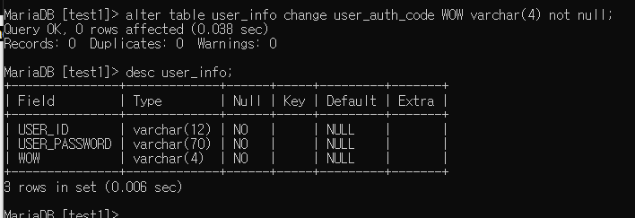 alter table user_info change user_auth_code WOW varchar(4) not null;