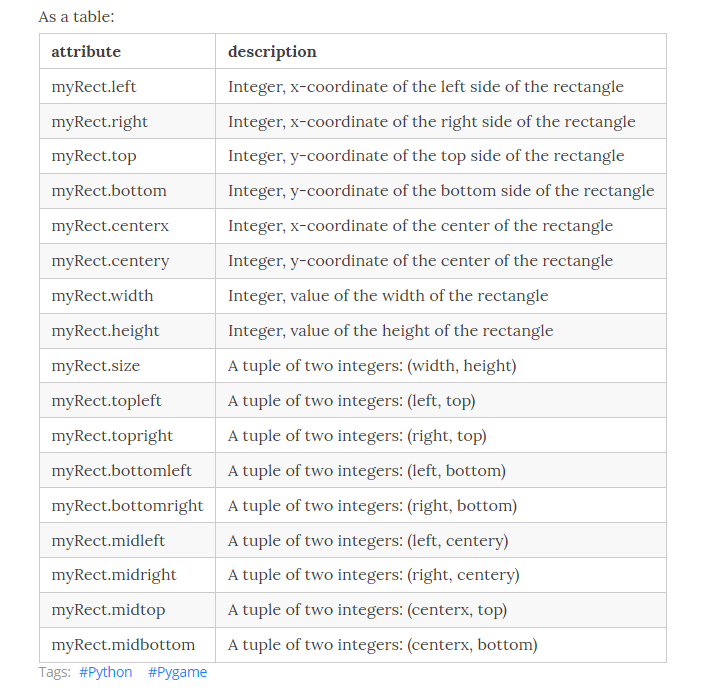 pygame에서는 pygame.rect 라는 직사각형 오브젝트를 제공한다.