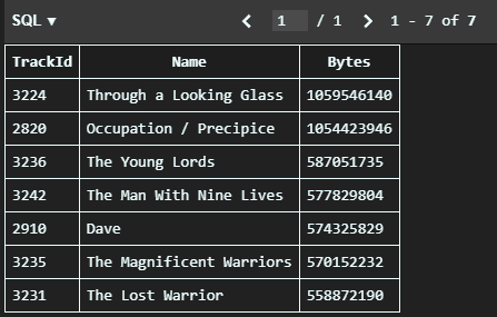 | tracks 테이블에서 TrackId, Name, Bytes 필드 데이터를 내림차순으로 7개 조회한다 (Bytes 기준 내림차순) |