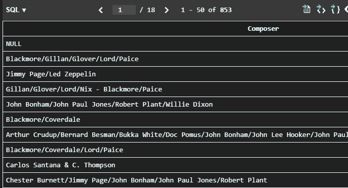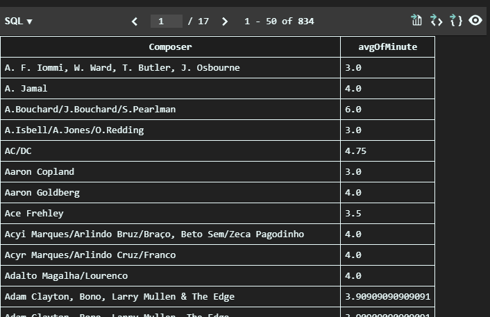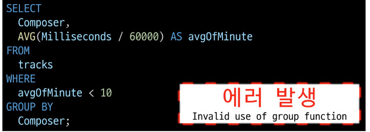 | tracks 테이블에서 Composer 필드를 그룹화한다 각 그룹에 대한 Milliseconds의 평균값이 10 미만인 데이터를 조회한다. Milliseconds 필드는 60000으로 나눠 분 단위 값의 평균으로 계산한다 HAVING 집계 항목에 대한 세부 조건을 지정한다 주로 GROUP BY와 함께 사용된다 만약, GROUP BY가 없다면 WHERE처럼 동작한다 |