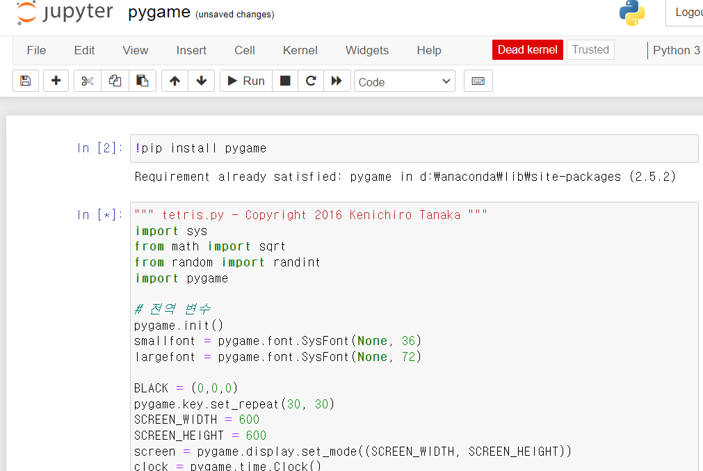 테트리스는 「게임으로 배우는 파이썬」에서 제공된 기본 소스코드에 추가하는 방식으로 개발해보도록 하겠습니다.