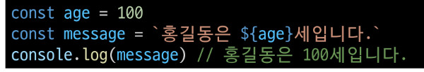 | 내장된 표현식을 허용하는 문자열 작성 방식 백틱(``)을 이용하며 여러 줄에 걸쳐 문자열을 정의할 수 있다 JavaScript 변수를 문자열 안에 바로 연결할 수 있다. 표현식은 '$'와 중괄호(${expression})로 표기한다 ES6+부터 지원 |