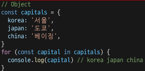 for ...in은 인덱스의 순서가 중요한 배열에서는 사용하지 않는다.