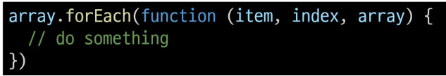 콜백함수는 3가지 매개변수로 구성된다 item : 처리할 배열의 요소 index : 처리할 배열 요소의 인덱스 (선택 인자) array : forEach를 호출한 배열 (선택 인자) 반환 값 undefined |