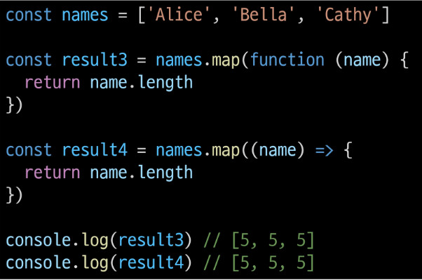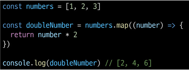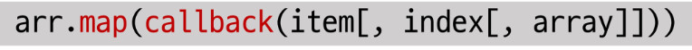 | forEach의 매개 변수와 동일하다 반환 값 배열의 각 요소에 대해 실행한 "callback의 결과를 모은 새로운 배열" forEach 동작 원리와 같지만, forEach와 달리 새로운 배열을 반환한다 |