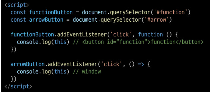 | 화살표 함수는 자신만의 this를 가지지 않기 때문에 자신을 포함하고 있는 함수의 this를 상속받는다 this를 사용해야하는 경우 addEventListener에서는 일반 함수로 사용하기 |