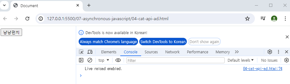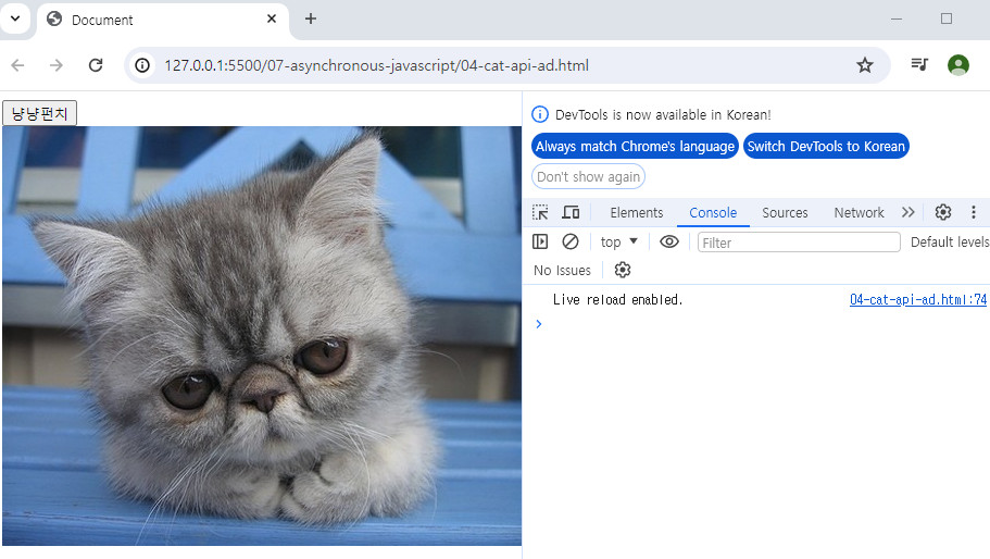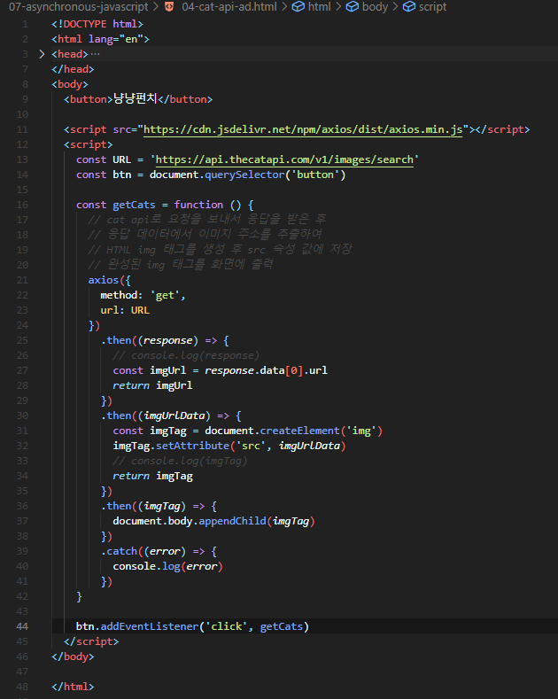| [JavaScript][비동기] 3. 실습 _ 고양이 사진 가져오기 (0) | 2024.04.23 |