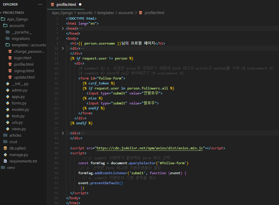 {% comment %} 1. 요청은 axios로 대체되기 때문에 form 태그의 action과 method를 삭제 {% endcomment %}