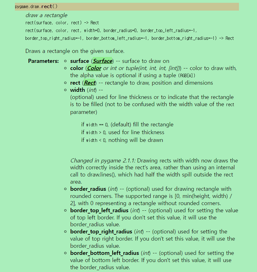 우선, 일단 정보가 없어서 좀 막막하긴 한데... 일단은 pygame 라이브러리 설명서 좀 읽어보기로 했다. 여기서는 pygame.draw.rect를 사용한다고 하니 한번 찾아보자.