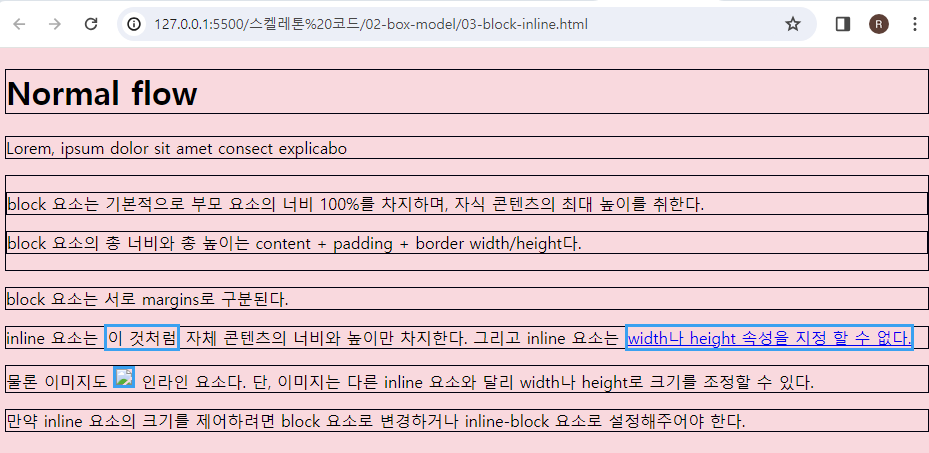 Inline a, img, span 다른 요소를 수평방향으로 밀어낼 수 있지만, 위아래로 밀어낼 수는 없다. Inline 본인의 영역이 커지기는 했지만, 다른 요소들을 밀어낼 수 는 없음 a, span, img { /* inline 요소들 */ border: 3px solid rgb(58, 161, 240); /* padding을 사용해서 수직방향으로 밀어내보기 */ padding-top: 100px; } Inline은 수평방향으로는 다른 요소들을 밀어낼 수 있음 아래에 보면 "자체 콘텐츠..."라는 말이 오른쪽으로 밀려난 걸 알 수 있음 a, span, img { /* inline 요소들 */..