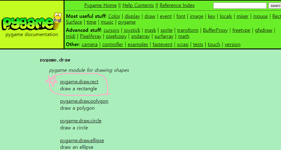 ▶ 미션 _ 완성해야 할 함수 1. FIELD = [] pygame.draw.rect array.insert(i,x) 2. set_game_field() 3. draw_game_field() 책의 가이드를 따라, 하나씩 미션을 수행해봅시다. set_game_field()에서 전체적인 맵 값을 입력하고, draw_game_field()에서 입력한 필드값을 출력해보겠습니다. 1. FIELD = [] 우선, 일단 정보가 없어서 좀 막막하긴 한데... 일단은 pygame 라이브러리 설명서 좀 읽어보기로 했다. 여기서는 pygame.draw.rect를 사용한다고 하니 한번 찾아보자. ▷ pygame.draw.rect https://www.pygame.org/docs/ref/draw.html#pygame.draw...